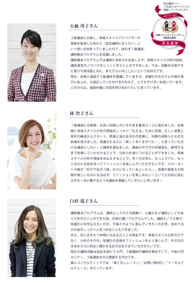 骨格スタイル協会は、「似合うファッションの楽しみ方を伝えることにやりがいと喜びを感じる方」に講師になってほしいと願っています。 伝える楽しさ、似合うファッションを身に付ける喜び、同じ想いを持つ仲間達、自分自身の成長を通して講師を仕事に することのやりがいなど、講師という仕事を通して得られるのは収入だけではありません。 似合うファッションの楽しみ方を伝えることで、受講生の皆さんが輝くこと、そして、講師の皆さんの人生が一層輝きを増し充実した日々を送られることを心から願っています。